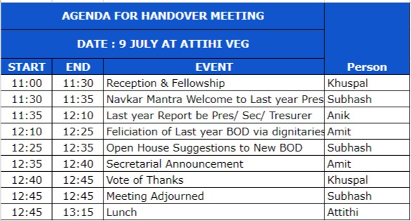 The meeting went on smoothly as planned . The meeting was attended by past Presidents and secretaries with spouses, last committee 19-23 with spouses and present committee 23-25 with spouses and chayan committee 2023 with spouse.