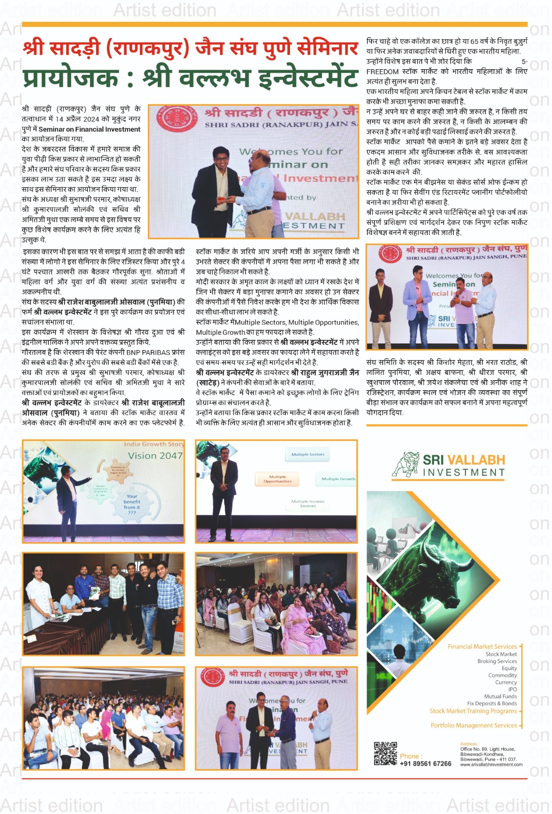 श्री सादड़ी (राणकपुर) जैन संघ पुणे के तत्वाधान में १४ अप्रैल २०२४ को मुकुंद नगर पुणे में Seminar on Financial Investment का आयोजन किया गया.